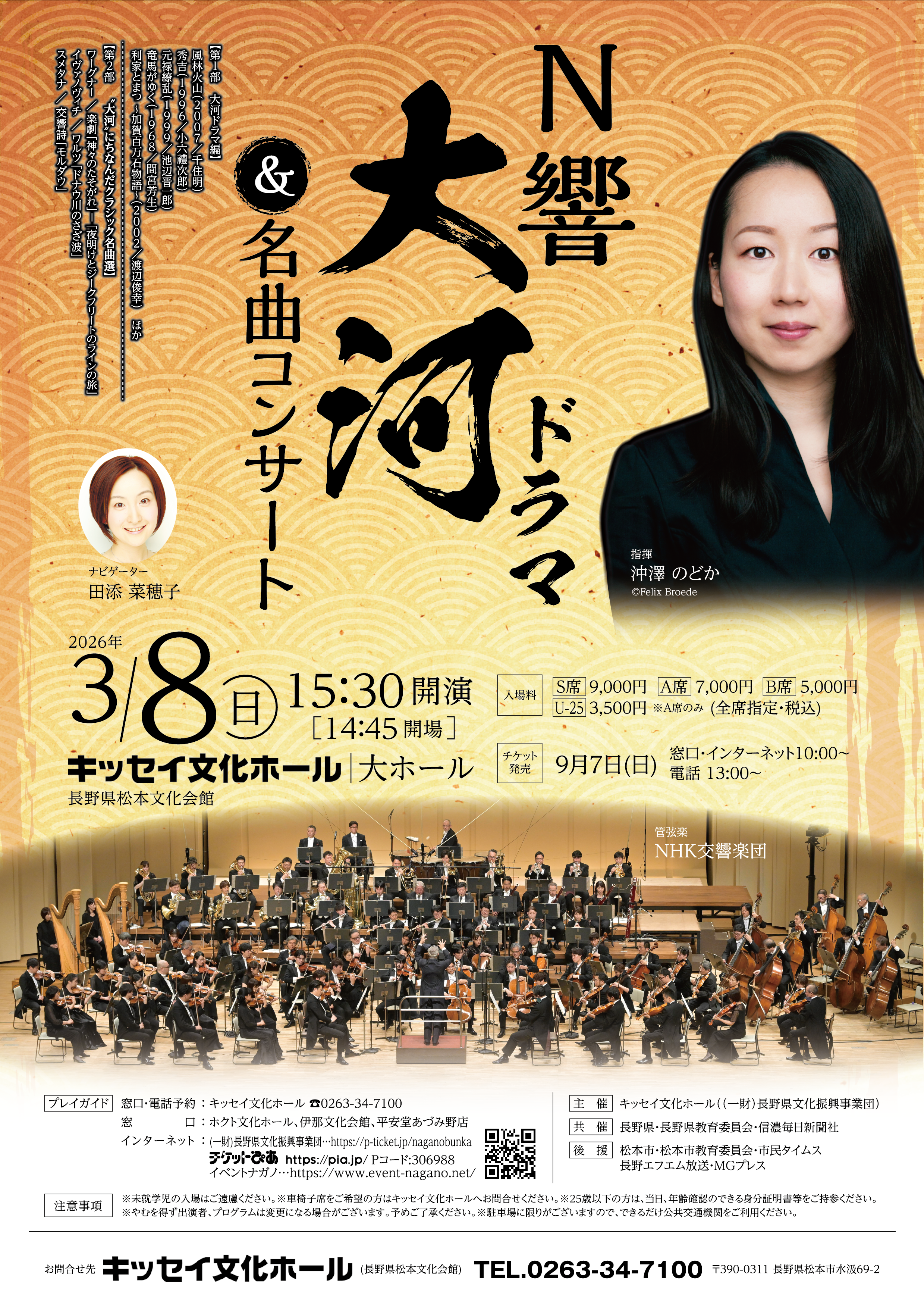 ※未就学児の入場はご遠慮ください。※車椅子席をご希望の方はキッセイ文化ホールへお問合せください。※25歳以下の方は、当日、年齢確認のできる身分証明書等をご持参ください。※やむを得ず出演者、プログラムは変更になる場合がございます。予めご了承ください。※駐車場に限りがございますので、できるだけ公共交通機関をご利用ください。