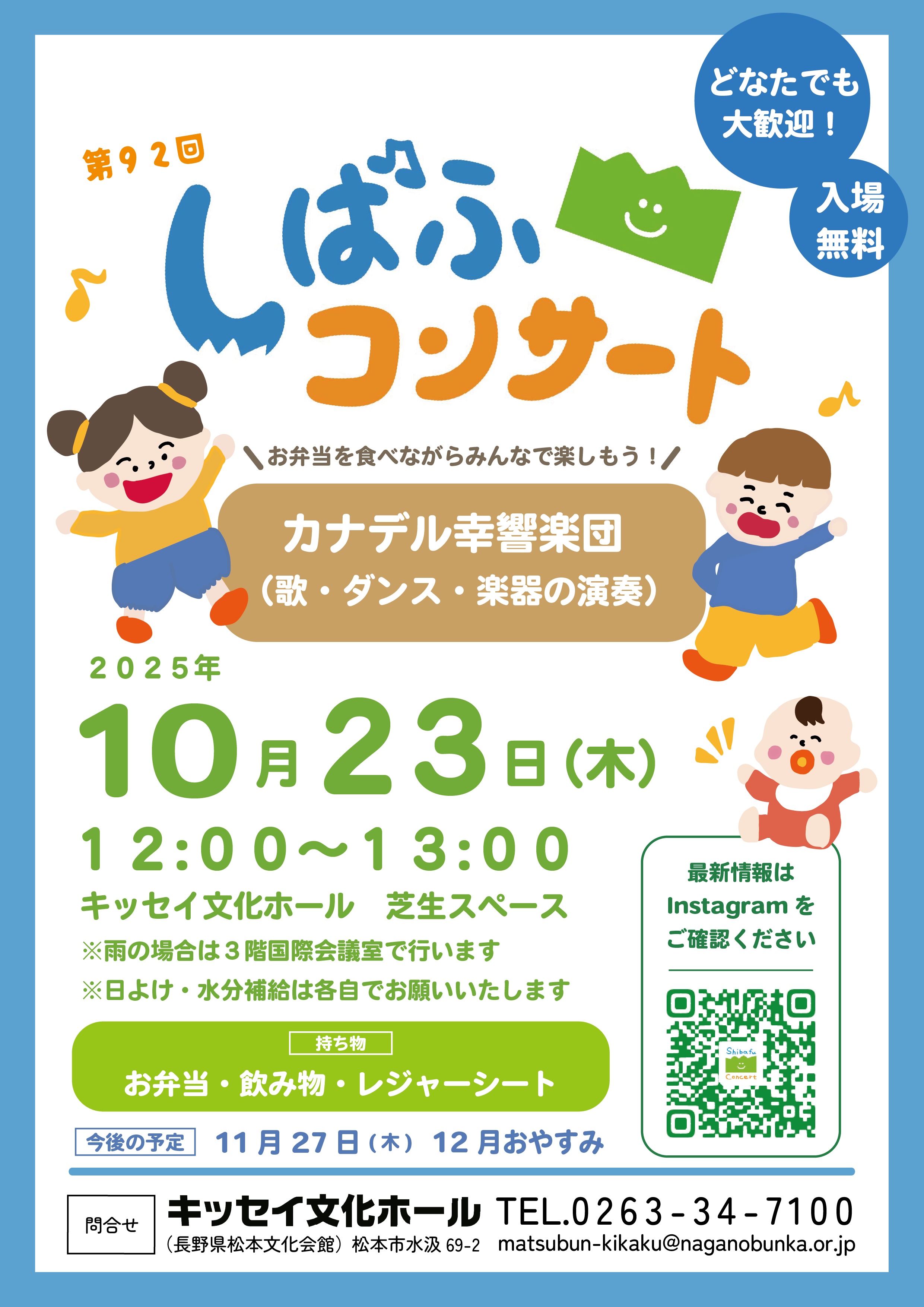 カナデル幸響楽団の皆さんによる歌やダンス、楽器の演奏をお届けします!☆会場変更などの最新情報は当館インスタグラム(ID: naganomatsubun )をご確認ください。